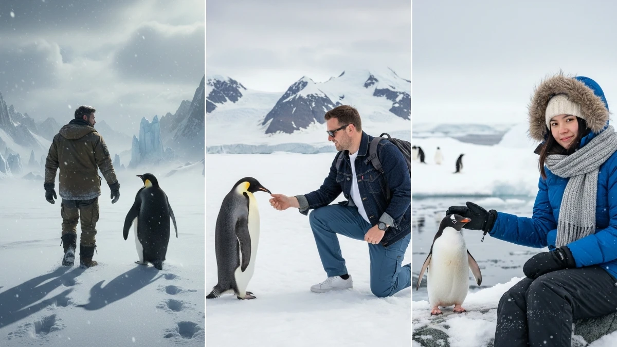 Build the background with icy terrain, distant glaciers, and snow-covered mountains, bathed in soft daylight and cool atmospheric tones. Use cinematic depth of field, sharp DSLR-style focus, natural shadows, and accurate skin texture to enhance realism. The final image should feel like a professionally captured wildlife travel portrait—immersive, balanced, and photorealistic in 4K-level detail with seamless blending and true-to-life color grading."