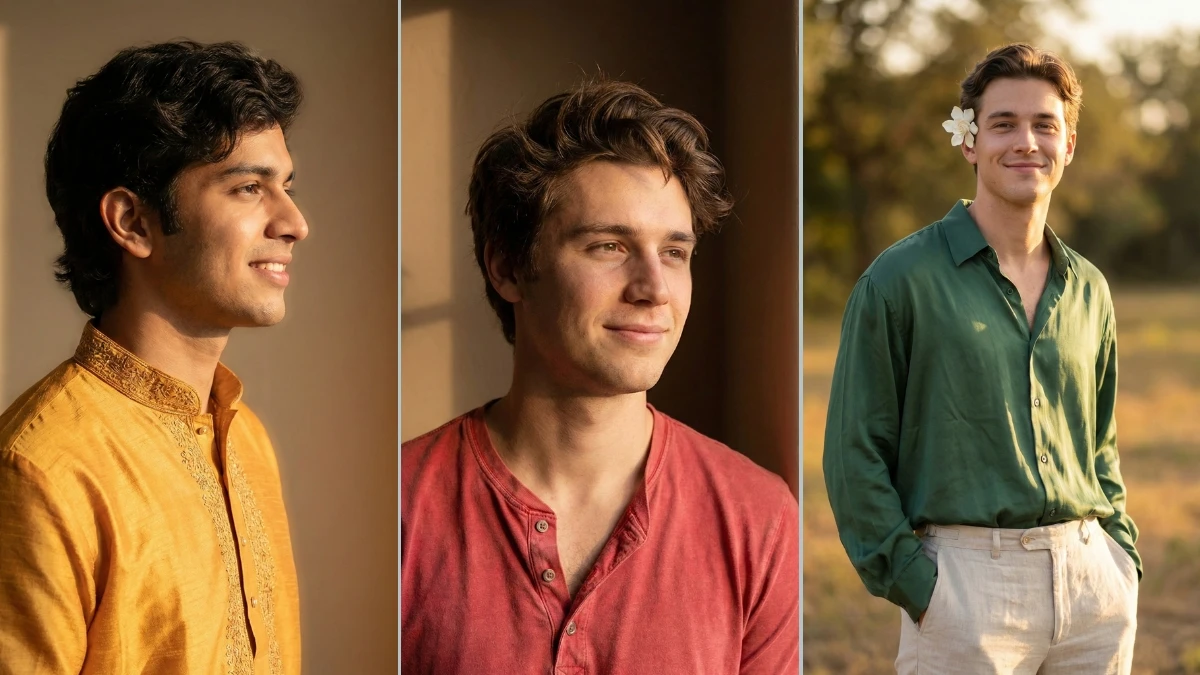 "Create a sunlit portrait of a young man standing confidently against a soft, golden background. He wears a flowing green silk shirt with a deep collar, paired with light beige trousers that give off a relaxed, yet elegant vibe. A delicate white flower is tucked behind his ear, adding a touch of nature and softness to the look. The warm golden hour light accentuates the natural highlights of his skin, casting gentle shadows that create depth and dimension. The relaxed posture with hands casually in pockets, combined with the gentle expression, evokes a carefree and approachable energy. The overall ambiance should feel fresh, stylish, and subtly artistic."