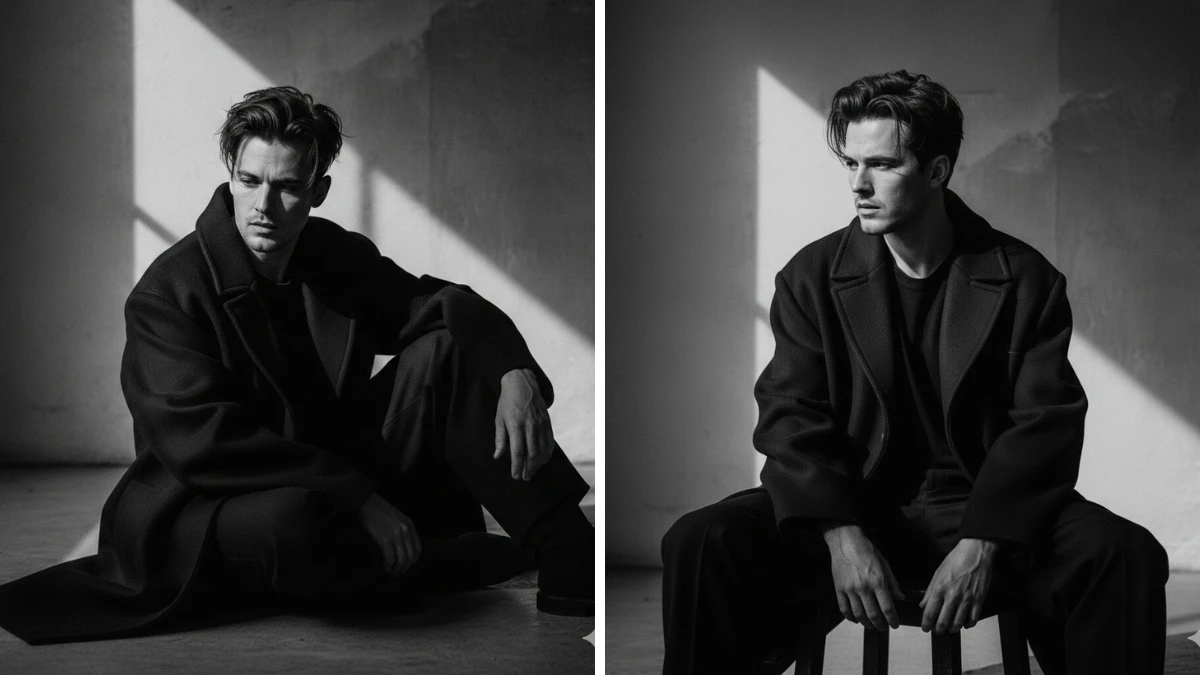 "Generate a timeless black-and-white editorial portrait using my uploaded image, ensuring the face, eyes, and expression remain 100% accurate. The subject is seated on a simple stool in a minimalist studio space with soft side lighting that gently wraps around his features. He wears a structured oversized coat, and his hair is natural, slightly messy, and full of texture. His pose is relaxed yet emotional, with one shoulder slightly turned and his gaze directed off-camera. The image is captured in a medium-close cinematic frame with crisp detail, balanced contrast, subtle film grain, and a clean, artistic background."