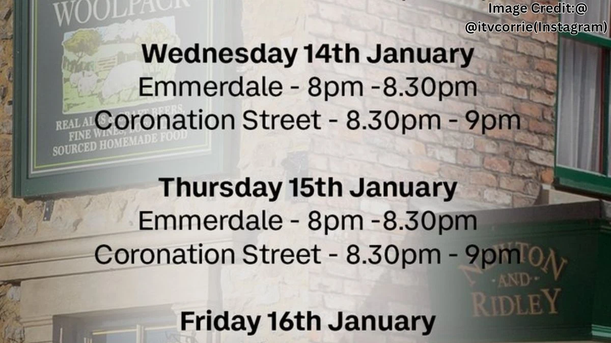 Wednesday 14 January — Emmerdale 8pm–8.30pm, Coronation Street 8.30pm–9pm.
