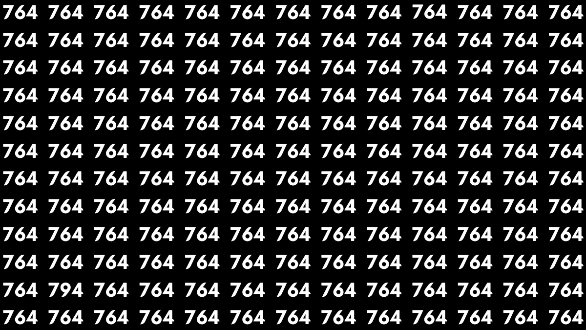 In the solution image, the number "794" is highlighted within the grid of repeated "764" numbers. It is located towards the lower-left corner of the image, making it challenging to spot among the many identical "764" entries.
