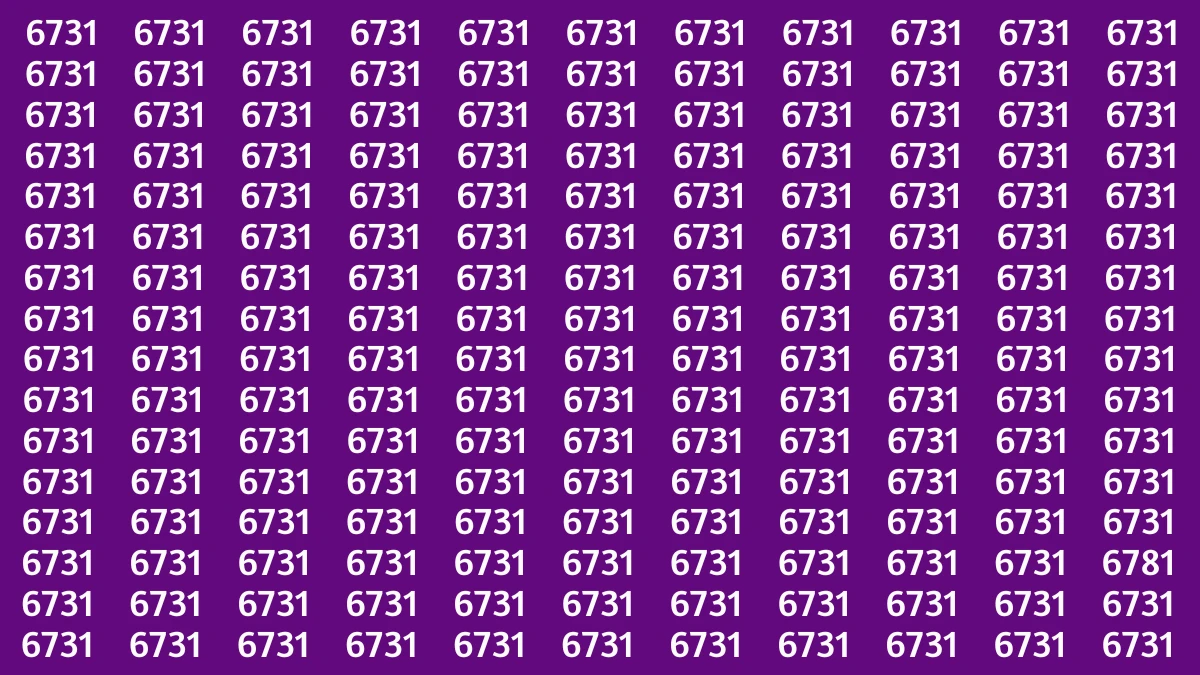 This optical illusion puzzle works by repeating the number 6731 in a uniform grid, encouraging the brain to assume that all entries are identical. The number 6781 is hidden within this pattern and differs by only one digit, making it easy to overlook at a quick glance.
