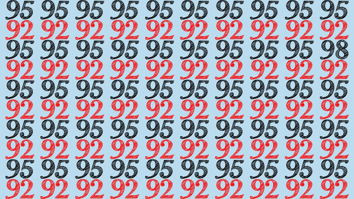 This quick optical illusion challenge puts your observation skills to the test in just nine seconds. At first glance, the grid looks like a simple pattern of repeating 95 and 92, but hidden among them is the number 98 waiting to be found.
