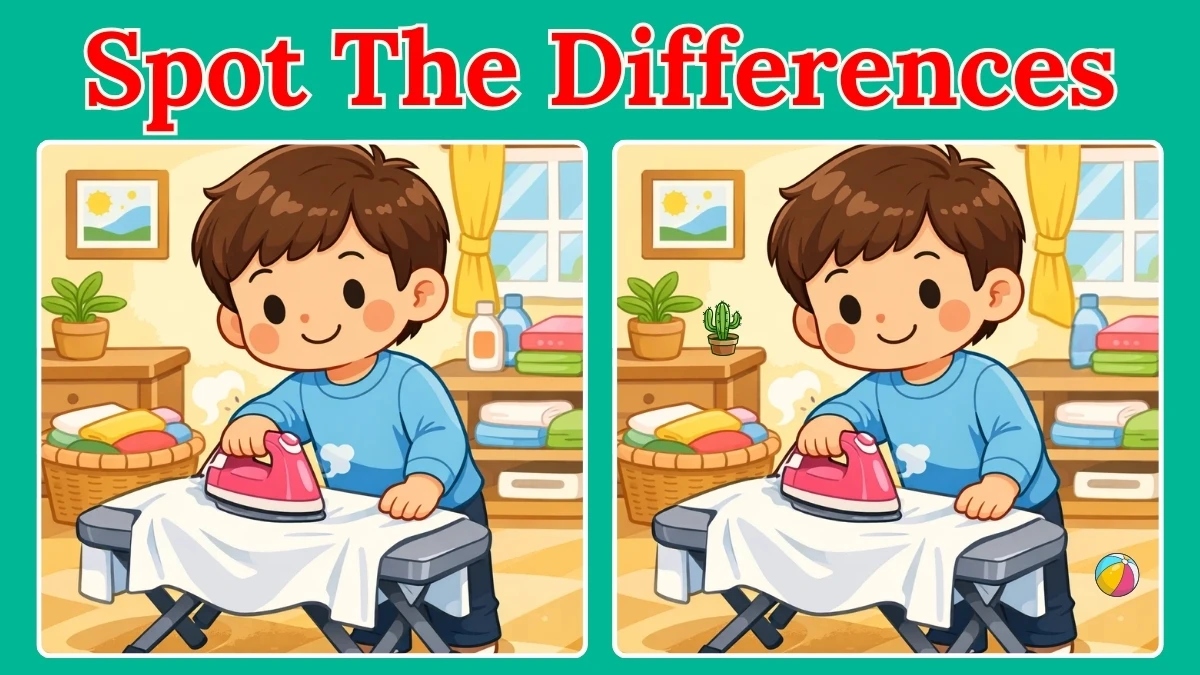 Ready to test your eagle eyes with a charming spot the difference challenge? This delightful puzzle features a cute little boy hard at work ironing a shirt in a cozy laundry room filled with plants, bottles, and colorful linens.
