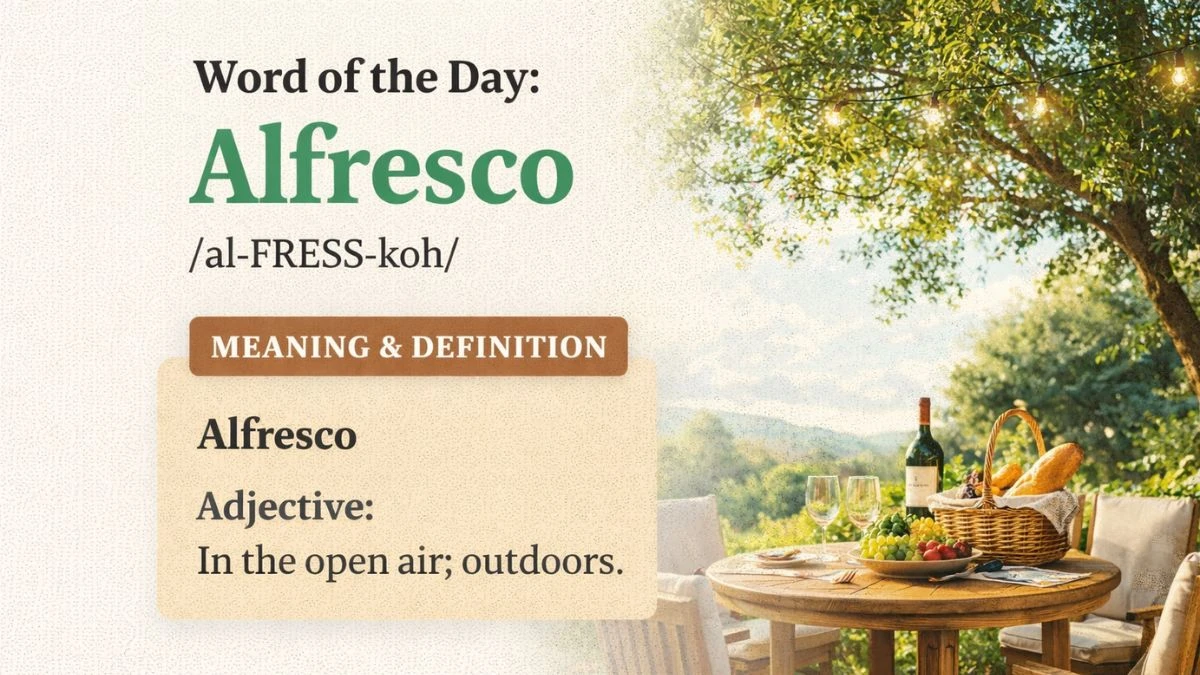 The word alfresco comes from Italian, derived from the phrase al fresco, which literally means “in the fresh [air].” It entered the English language in the 18th century, reflecting Europe’s growing appreciation for outdoor living and socializing. While its original Italian usage could sometimes imply being “in the cool” or even “in prison,” English adopted the more pleasant meaning—associating it with leisure, comfort, and open-air settings.